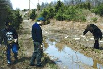 Drs. H. (left), F. (center), and K. examine the organisms, both terrestrial and