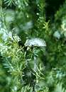 An abnormal insect pupae clinging to a nearby fir tree, also suffering genetic